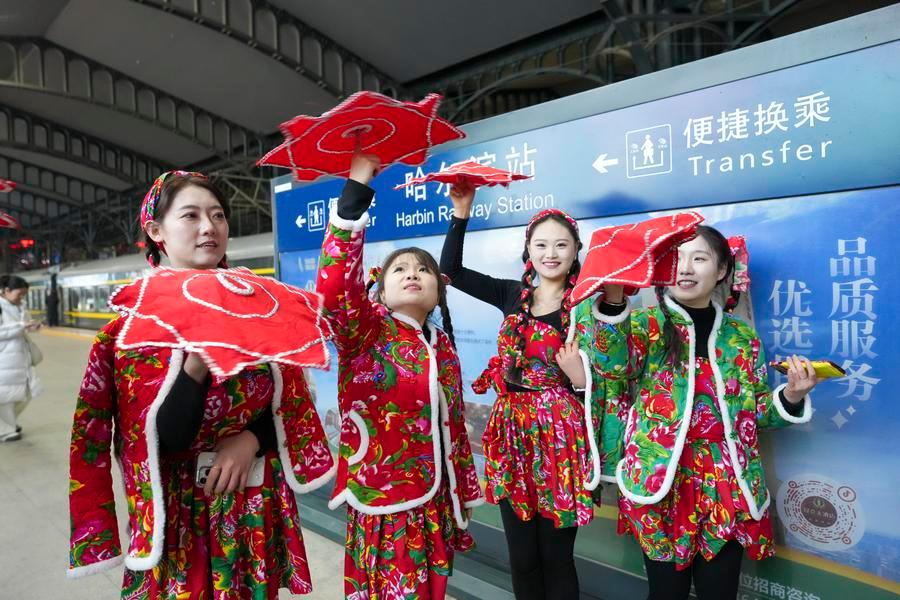 22日、ハルビン駅のホームで披露された民俗パフォーマンス。(ハルビン=新華社記者/王松)