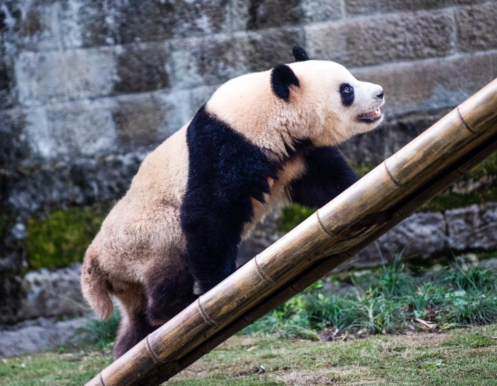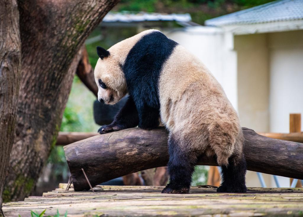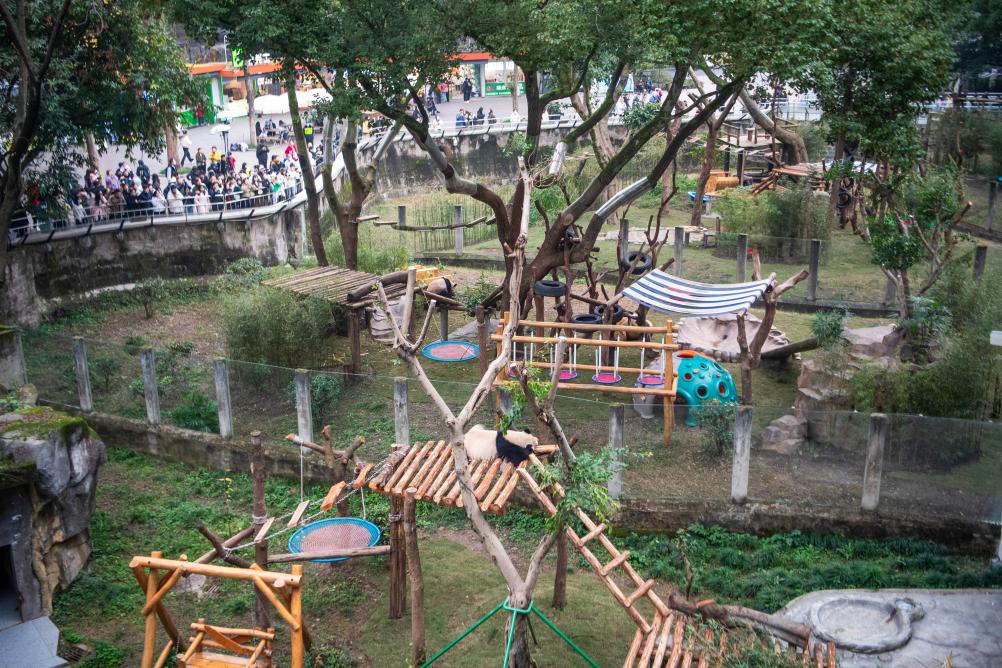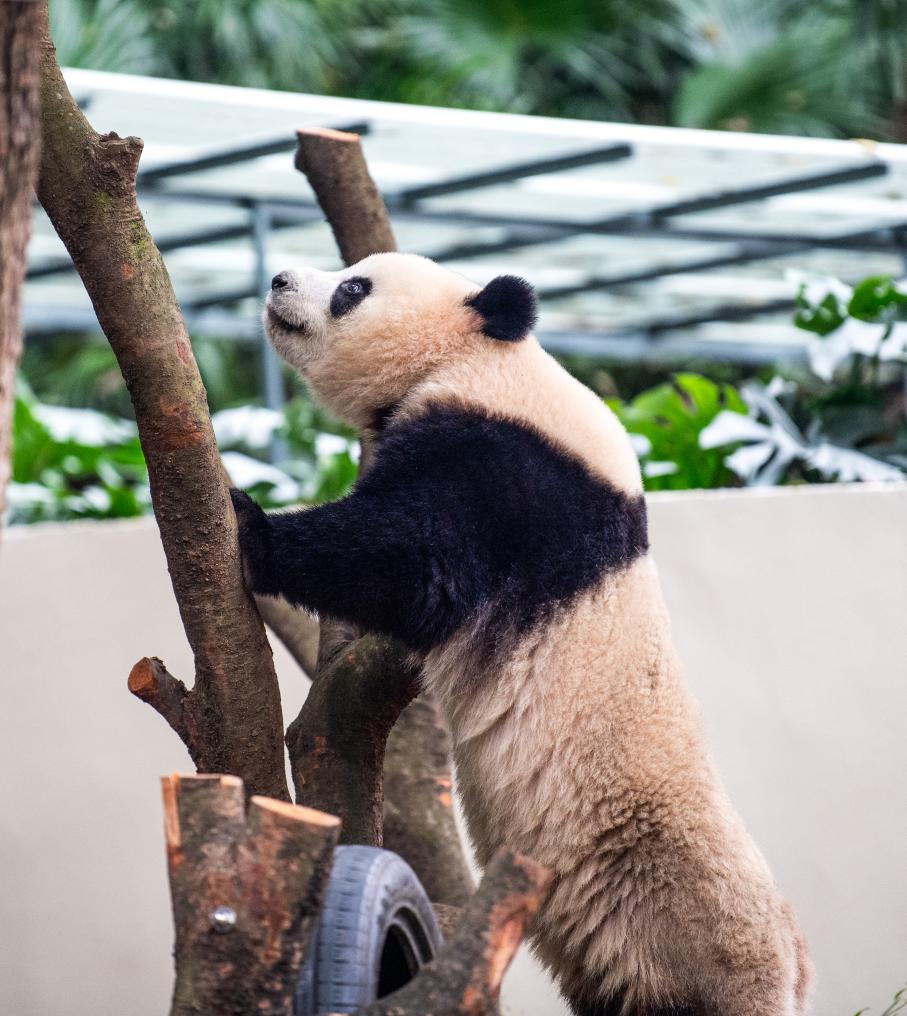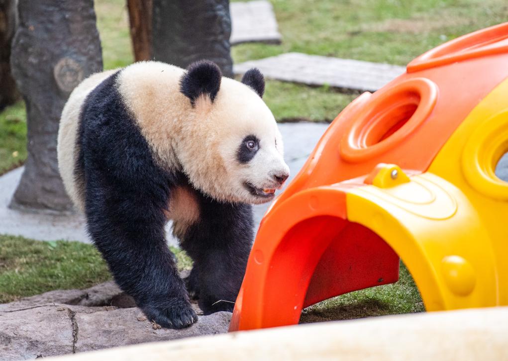 22日、重慶動物園で新居に入ったパンダ。(重慶=新華社記者/唐奕)