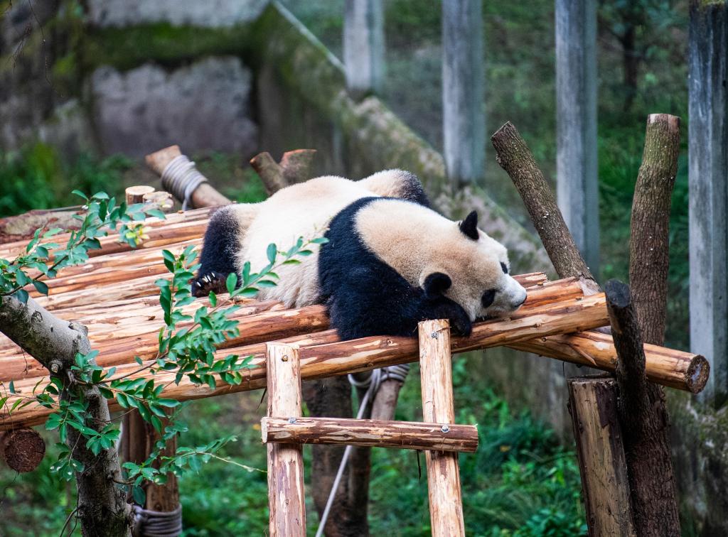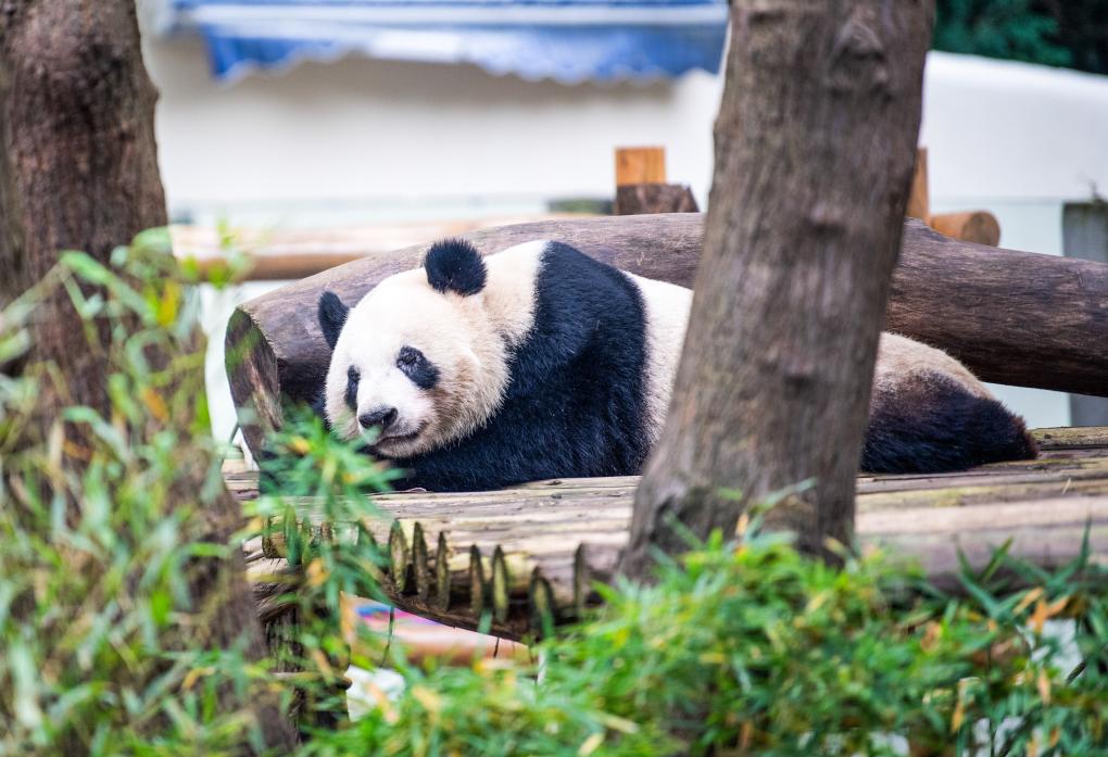 22日、重慶動物園の新居で寝そべるパンダ。(重慶=新華社記者/唐奕)
