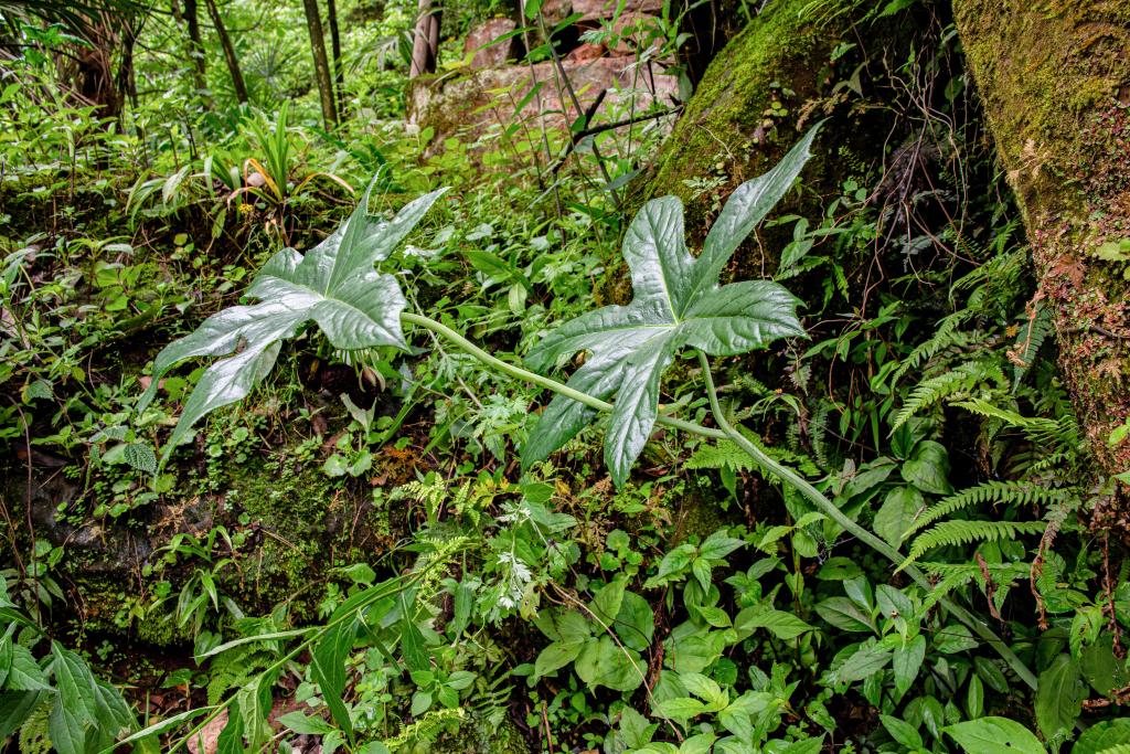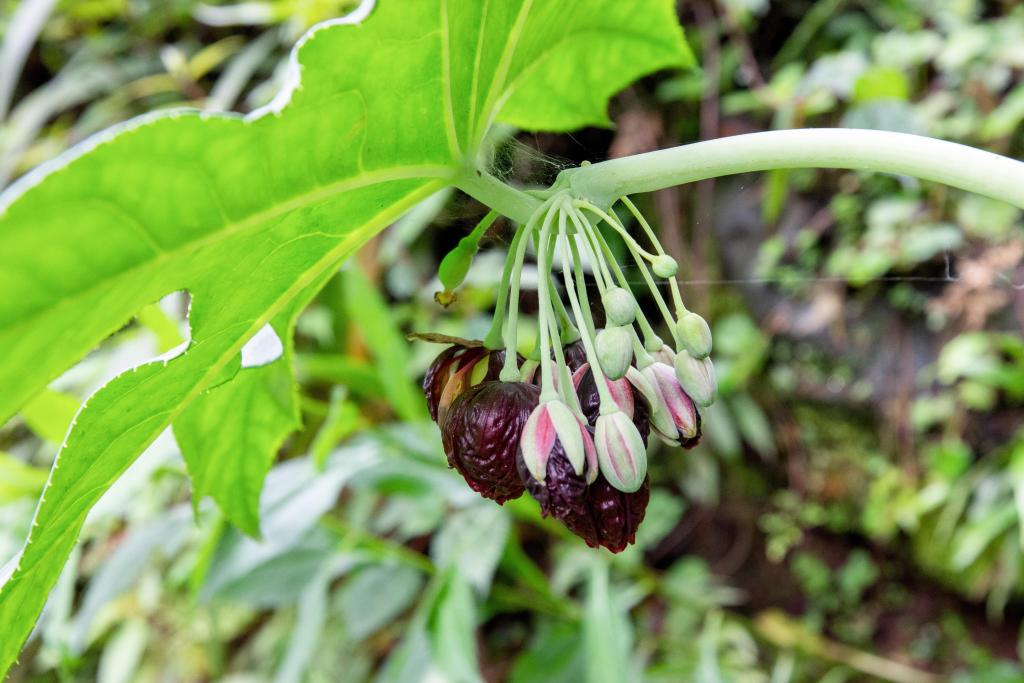 貴州省林業科学研究院の研究者、黄郎(こう・ろう)氏によると、習水八角蓮は保護区内の常緑広葉樹林の渓谷地帯に自生し、同属他種とは形態が明確に異なる。葉の裏や花梗(かこう)、萼片(がくへん)は毛がなく滑らかで、一つの花序に8~20個の花をつける。数回にわたる系統的調査で確認された野生個体数はわずか200株余りで、個体数が非常に少なく生息環境も特殊だという。中国では現在、ディソスマ属の全ての種が国家2級重点保護野生植物に指定されている。(記者/李黔渝)