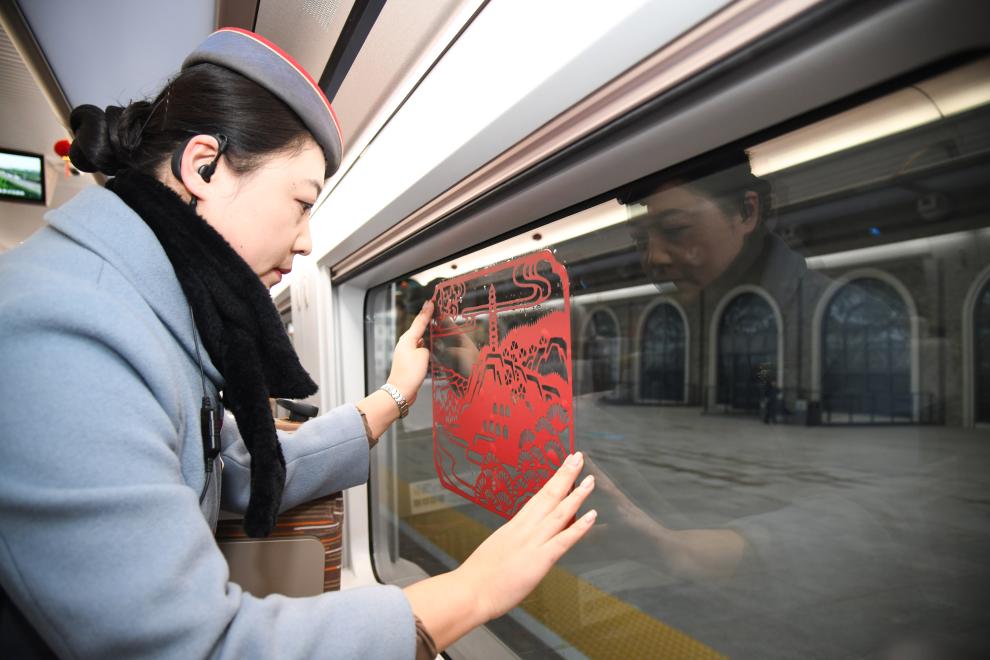 26日、延安駅で西延高速鉄道の一番列車で切り紙細工を窓に貼り車内を装飾する乗務員。(延安=新華社記者/張博文)