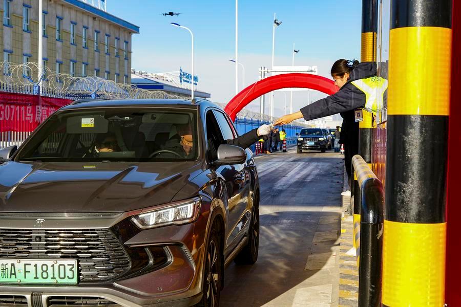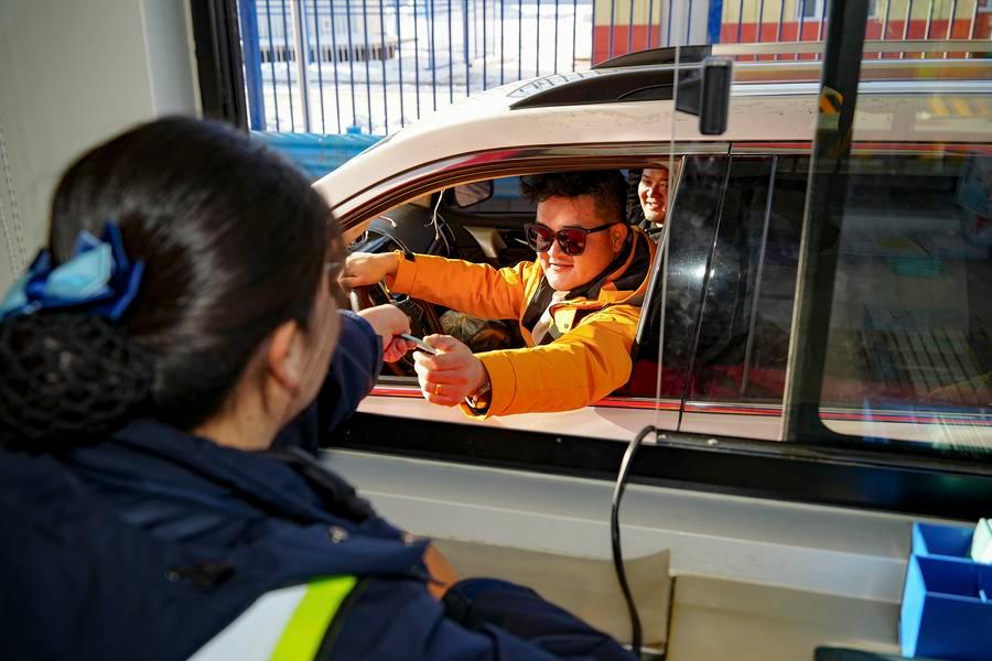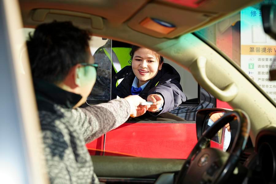 26日、ウルムチ市とロプノール県を結ぶ烏尉高速道路の永豊料金所で運転者に通行カードを渡す職員。(ウルムチ=新華社記者/徐宏岩)