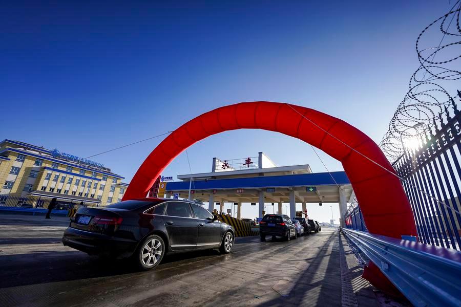 26日、ウルムチ県の永豊料金所を通過し、ウルムチ市とロプノール県を結ぶ烏尉高速道路に進入する車。(ウルムチ=新華社記者/徐宏岩)