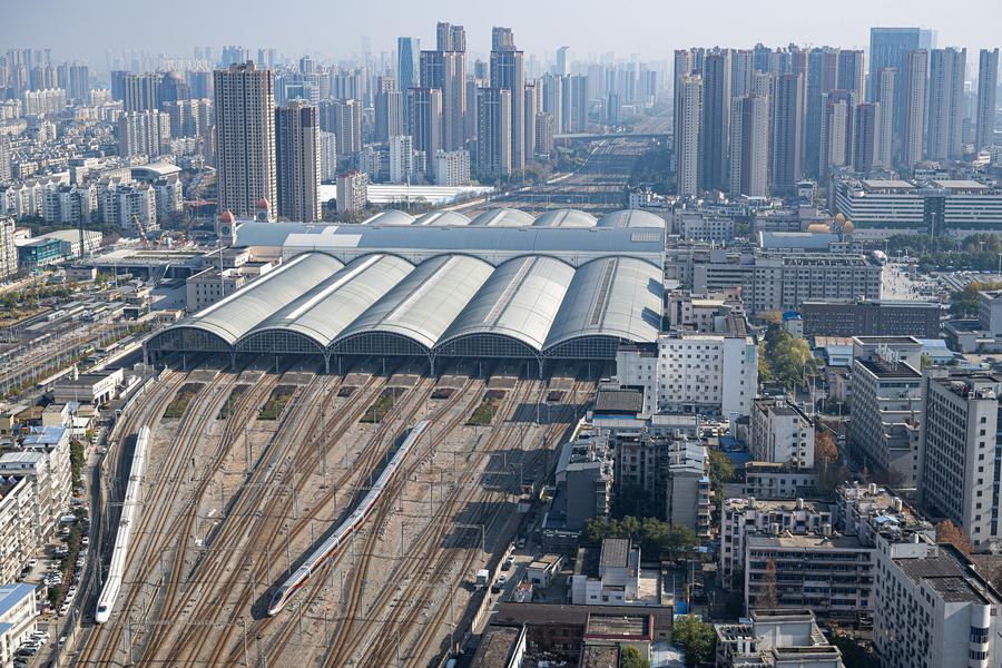 26日、湖北省の宜昌北駅に入る列車。(ドローンから、宜昌=新華社記者/伍志尊)
