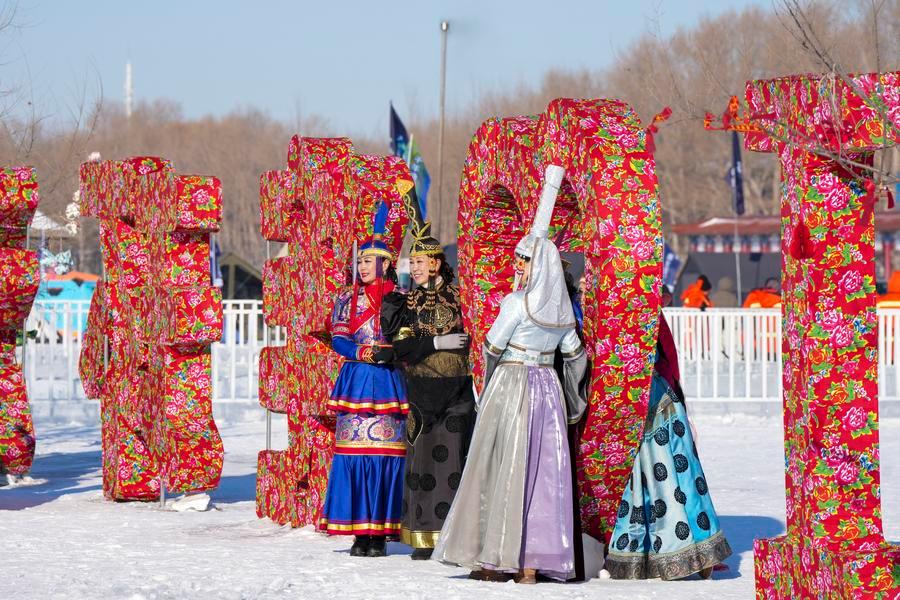 27日、氷雪漁猟ナーダムの会場で馬に乗る人々。(大慶=新華社記者/王松)