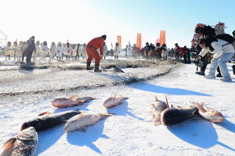 27日、凍結した湖面で行われた伝統漁の様子。(大慶=新華社記者/王松)
