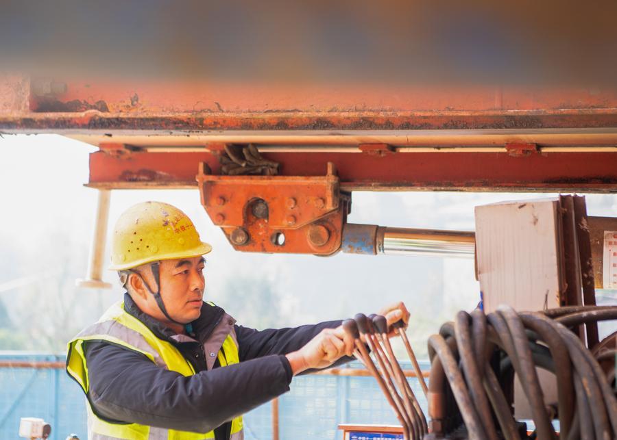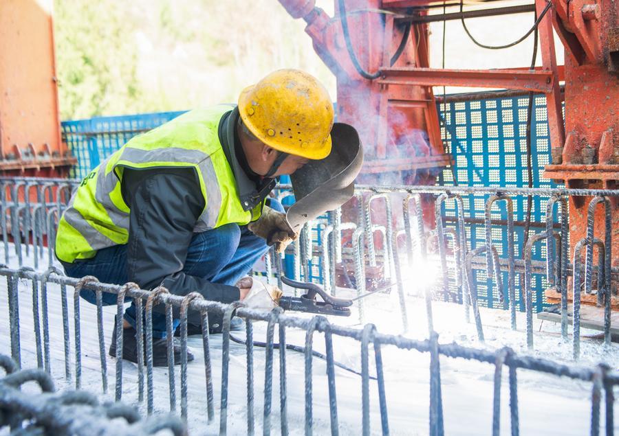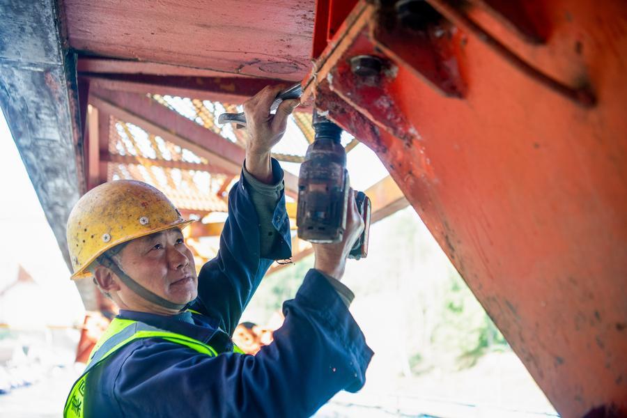 25日、普里河特大橋の建設現場で働く作業員。(重慶=新華社記者/唐奕)