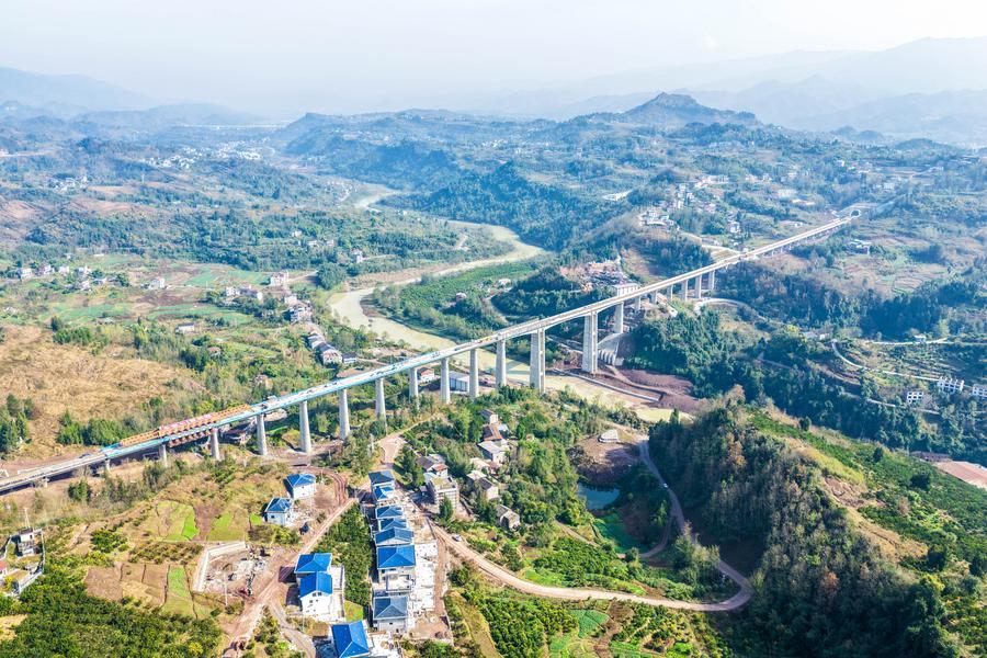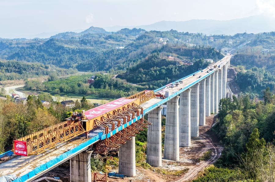 【新華社重慶12月28日】中国四川省の成都、達州両市と重慶市万州区の間で建設が進む成達万高速鉄道の普里河特大橋は25日、接合が完了した。計画通りの鉄道開通に向け、確かな基盤が築かれた。