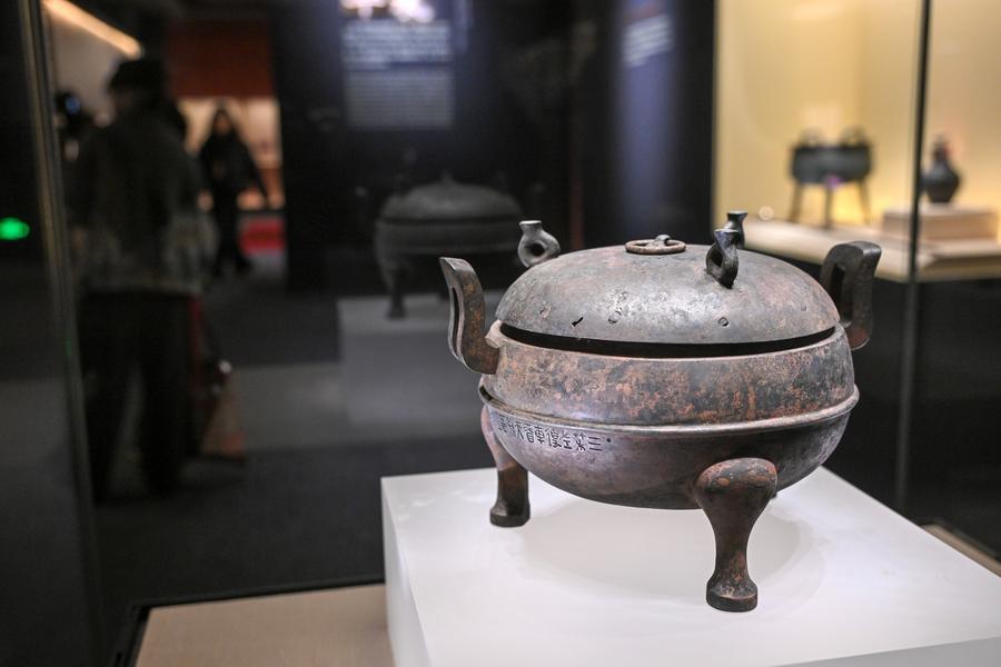 26日、中国国家博物館「安徽淮南武王墩1号墓考古成果展」に展示された青銅饋鼎(きてい)。(北京=新華社記者/金良快)