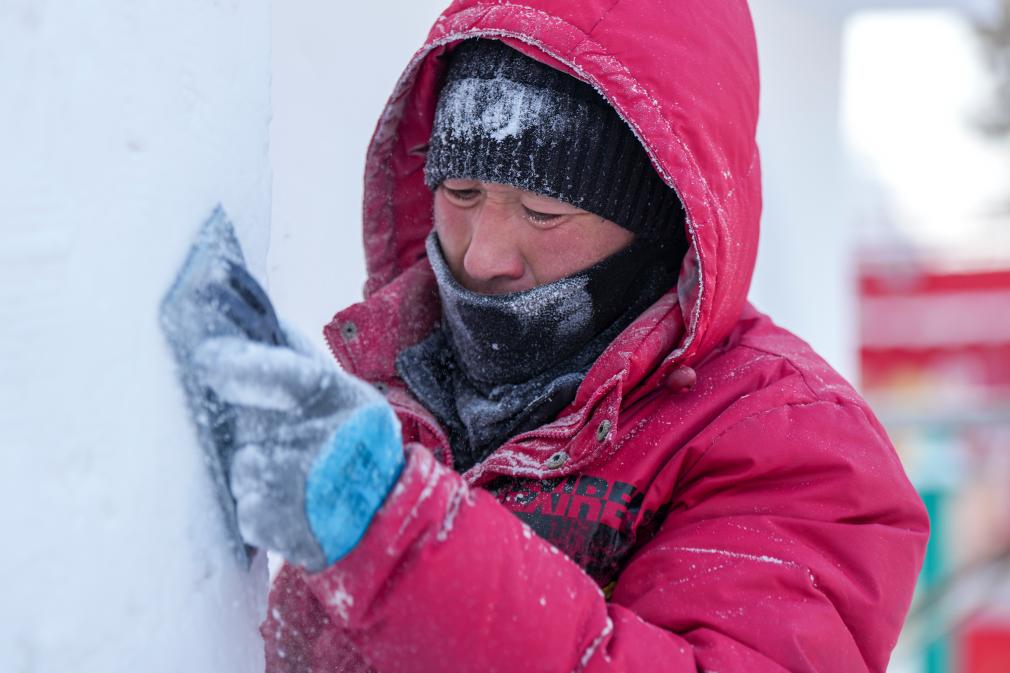 26日、太陽島国際雪像芸術博覧会の会場で、雪像を制作する人。(ハルビン=新華社記者/王松)