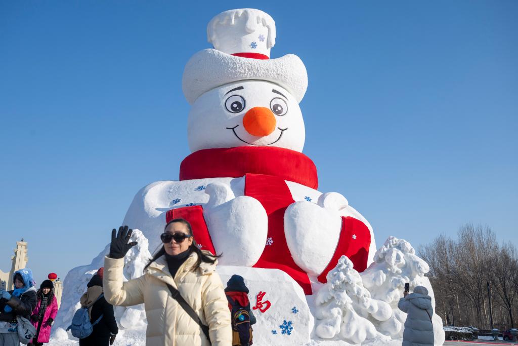 27日、太陽島国際雪像芸術博覧会で、雪像をバックに記念撮影する人。(ハルビン=新華社記者/張濤)