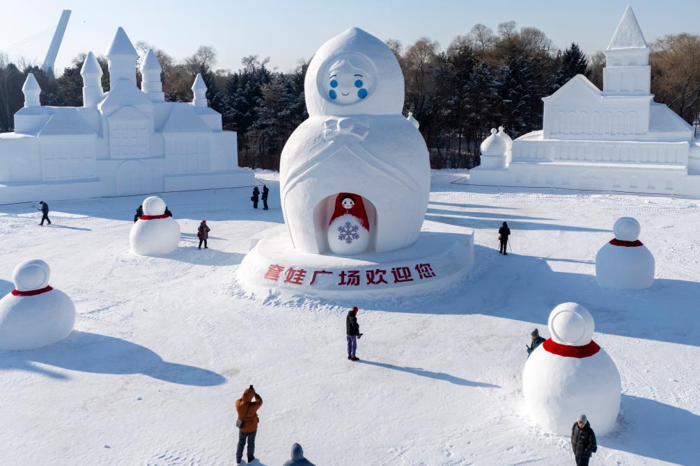 27日、太陽島国際雪像芸術博覧会を訪れた人たち。(ドローンから、ハルビン=新華社記者/張濤)