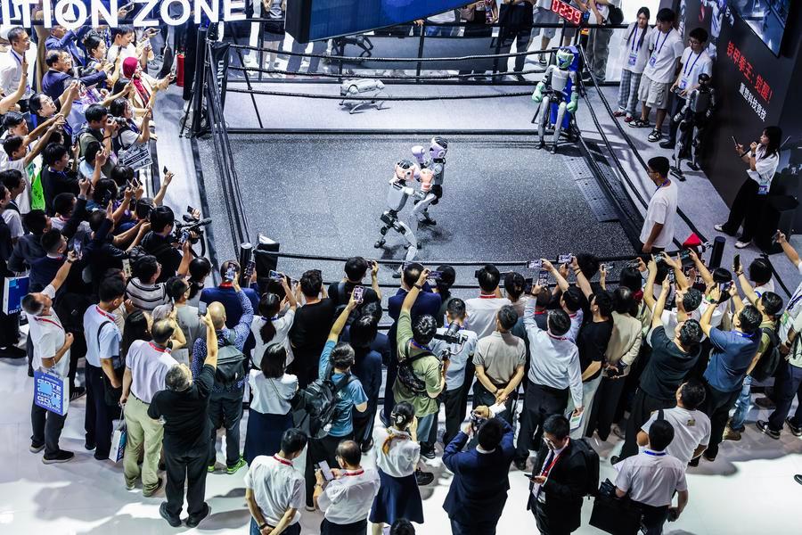 浙江省杭州市で開かれた第4回世界デジタル貿易博覧会のデジタル・スマート技術未来テーマ展示エリアに設けられた「杭州六小竜(杭州市のハイテク企業6社)」コーナーで、ロボットメーカー杭州宇樹科技(ユニツリー・ロボティクス)が開発した人型ロボットの格闘試合を見る人たち。(9月25日撮影、杭州=新華社記者/徐昱)