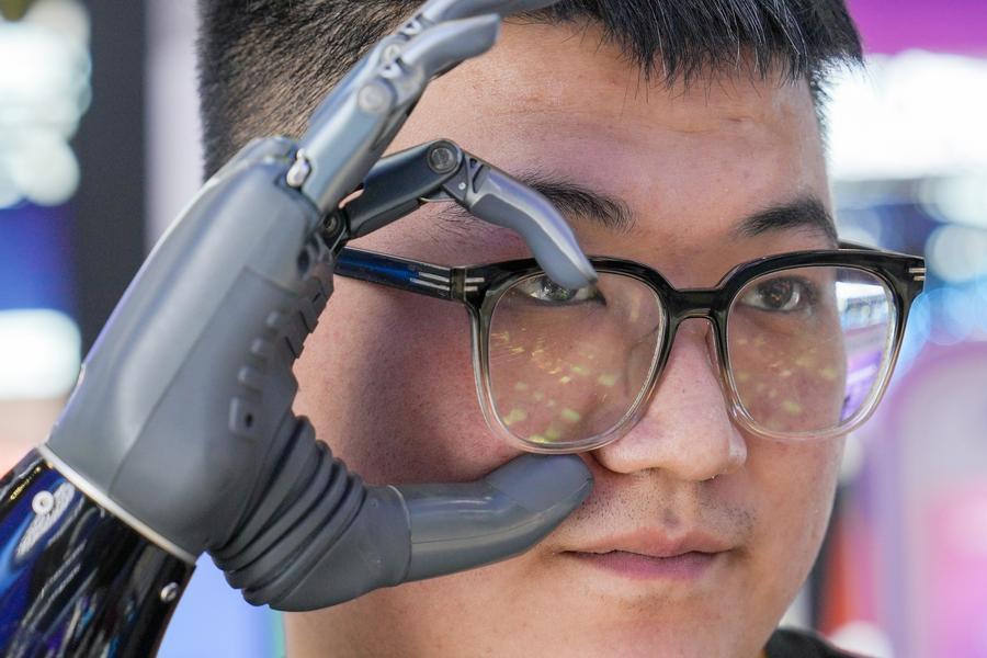 北京市で開かれた第3回中国国際サプライチェーン(供給網)促進博覧会のデジタル科技チェーン展示エリアで、スマートバイオニックハンドを装着してメガネを取り外すスタッフ。(7月17日撮影、北京=新華社記者/鞠煥宗)
