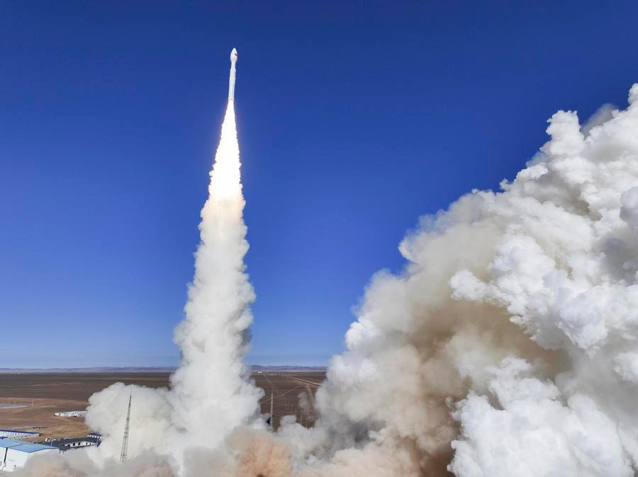 技術試験衛星「楚天2号」1、2号機を搭載し、東風商業宇宙イノベーション試験区から打ち上げられる運搬ロケット「力箭1号遥9」。(11月9日撮影、酒泉=新華社配信/汪江波)