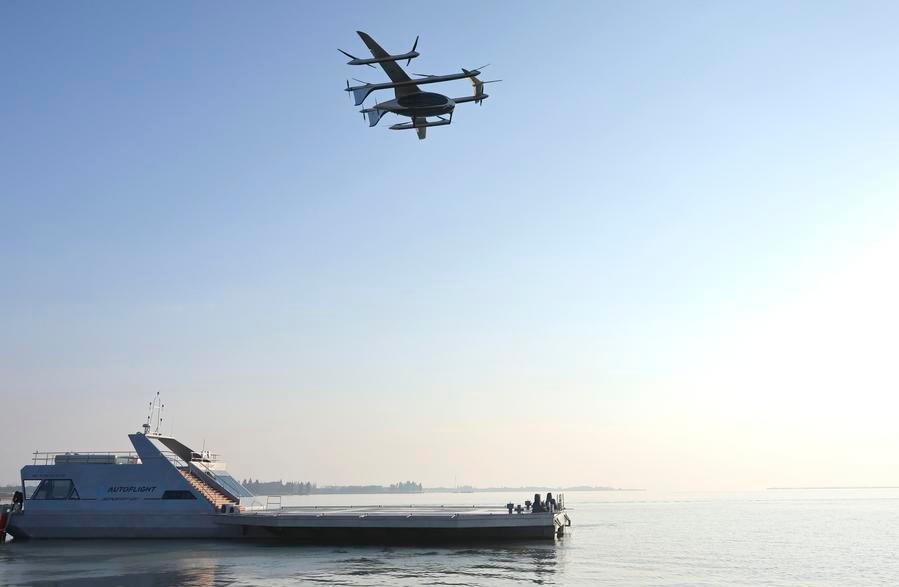 江蘇省昆山市で開かれた峰飛航空世界科技デーのイベントで、「水上空港」から離陸する電動垂直離着陸機(eVTOL)。(11月22日撮影、昆山=新華社記者/方喆)