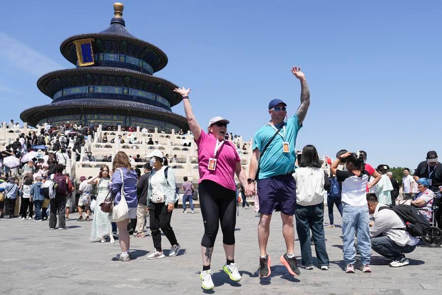 北京市の天壇公園祈年殿の前で記念撮影するオーストラリア人観光客。中国ではビザ免除政策に伴い外国人観光客が増え「チャイナトラベル」熱が高まった。(5月1日撮影、北京=新華社記者/鞠煥宗)