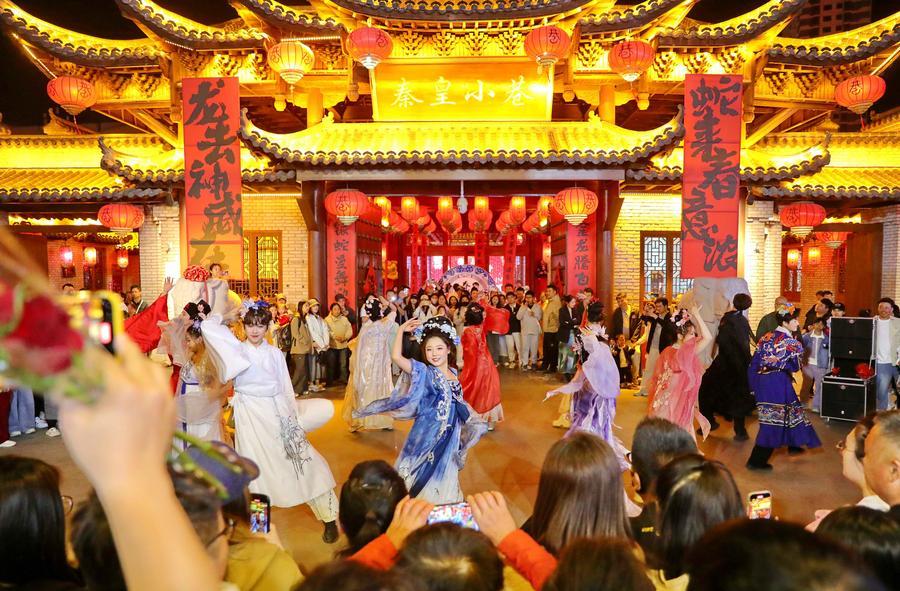 河北省秦皇島市海港区のグルメスポット「秦皇小巷」で、ダンスパフォーマンスを見る人たち。(5月3日撮影、秦皇島=新華社配信/曹建雄)