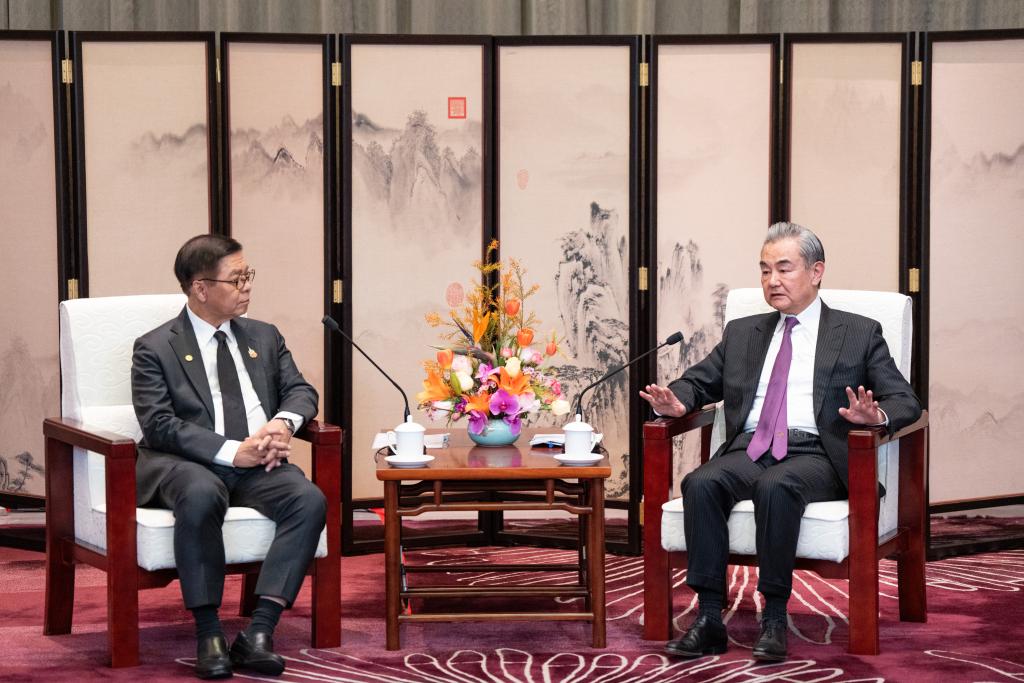 28日、シーハサック氏(左)と会談する王毅氏。(昆明=新華社記者/王冠森)