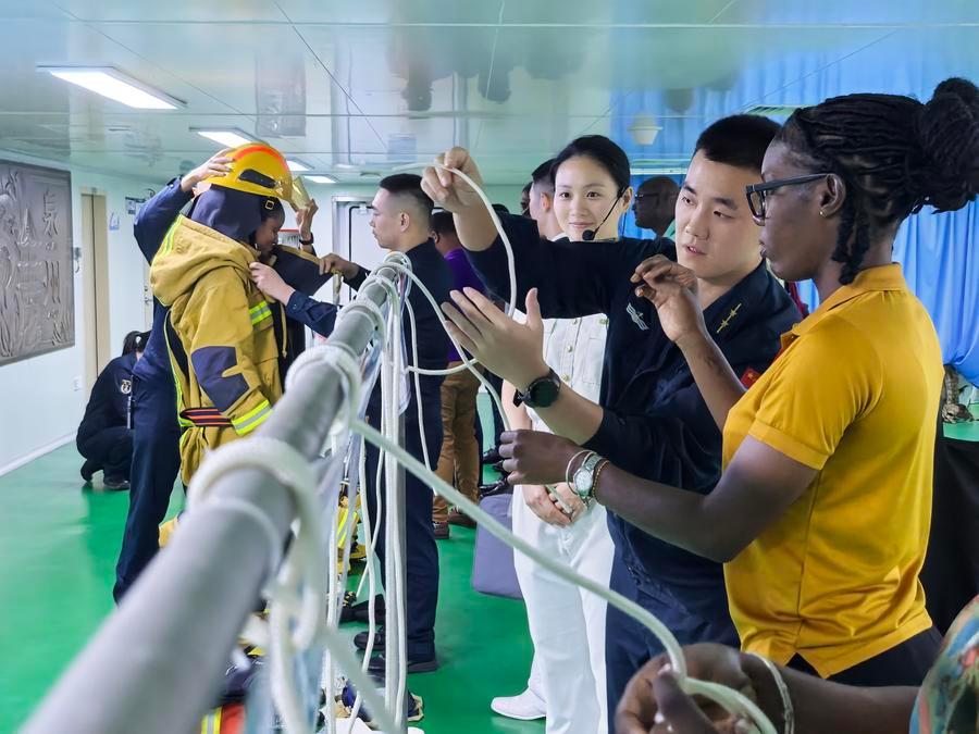 26日、バルバドス国防軍の受講生と交流する中国海軍の病院船「絲路方舟」の将兵。(バルバドス=新華社配信/崔暁洋)