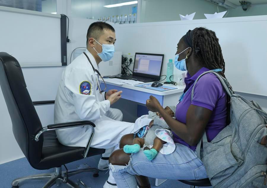 22日、バルバドスで地元の子どもの患者を診察する病院船小児科診療室の医師。(バルバドス=新華社配信/崔暁洋)