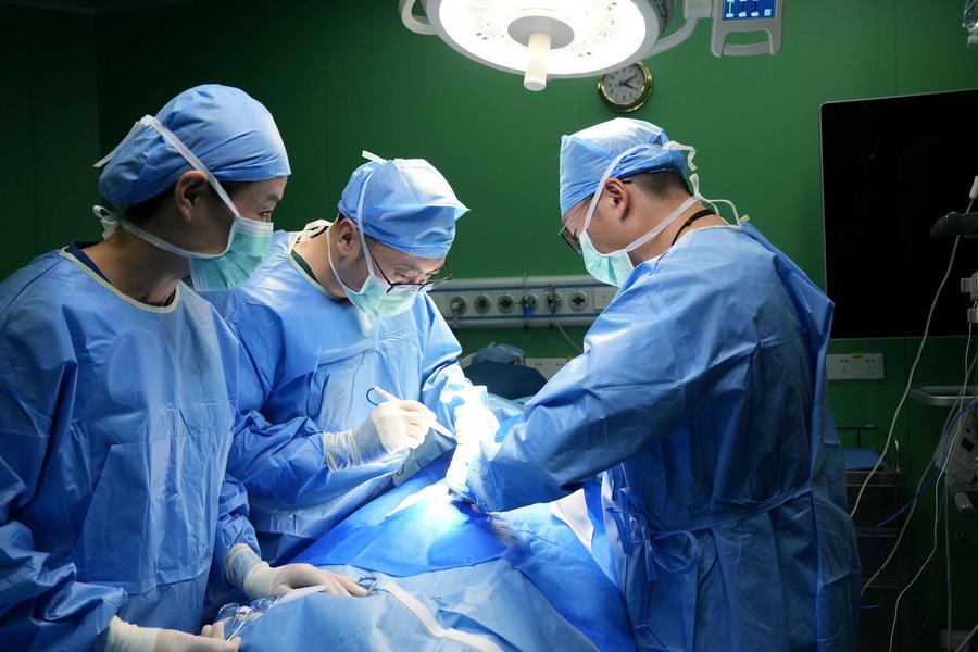 22日、バルバドスでヘルニアの患者を施術する医療従事者。(バルバドス=新華社配信/崔暁洋)