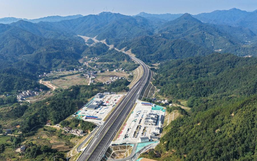 28日、広東省陽春市の陽信高速道路の永寧インターチェンジ。(ドローンから、陽春=新華社記者/鄧華)