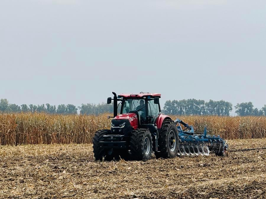黒竜江省ハルビン市双城区の農地で作業をするトラクター。(10月14日撮影、ハルビン=新華社記者/孫暁宇)