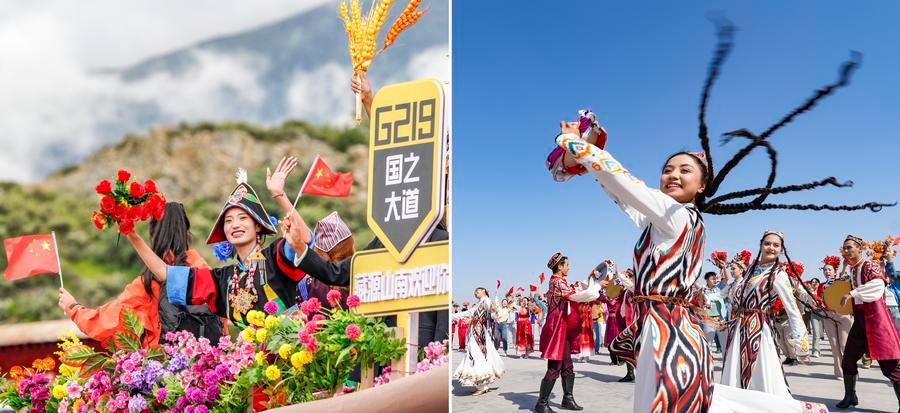 左:西蔵自治区ラサ市のポタラ宮広場を通過するフロート(山車)の上から手を振り自治区成立60周年を熱烈に祝う出演者。(8月21日撮影、ラサ=新華社記者/丁增尼達) 右:新疆ウイグル自治区成立70周年を歌と踊りで祝う人々。(9月23日撮影、ウルムチ=新華社記者/畢暁洋)