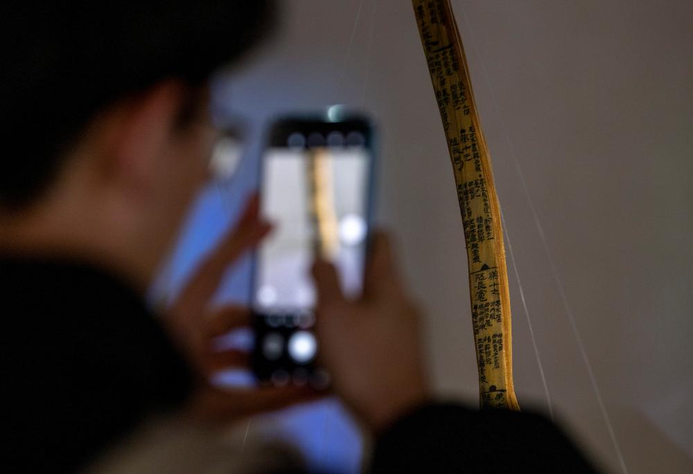 28日、内モンゴル博物院で漢代の簡牘を撮影する来場者。(フフホト=新華社記者/連振)