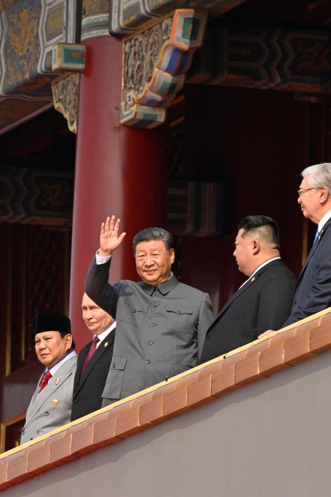 北京の天安門広場で盛大に開かれた中国人民抗日戦争・世界反ファシズム戦争勝利80周年記念大会で、外国首脳らと天安門城楼の上に立つ習近平中国共産党中央委員会総書記・国家主席・中央軍事委員会主席(中央)。(9月3日撮影、北京=新華社記者/岳月偉)