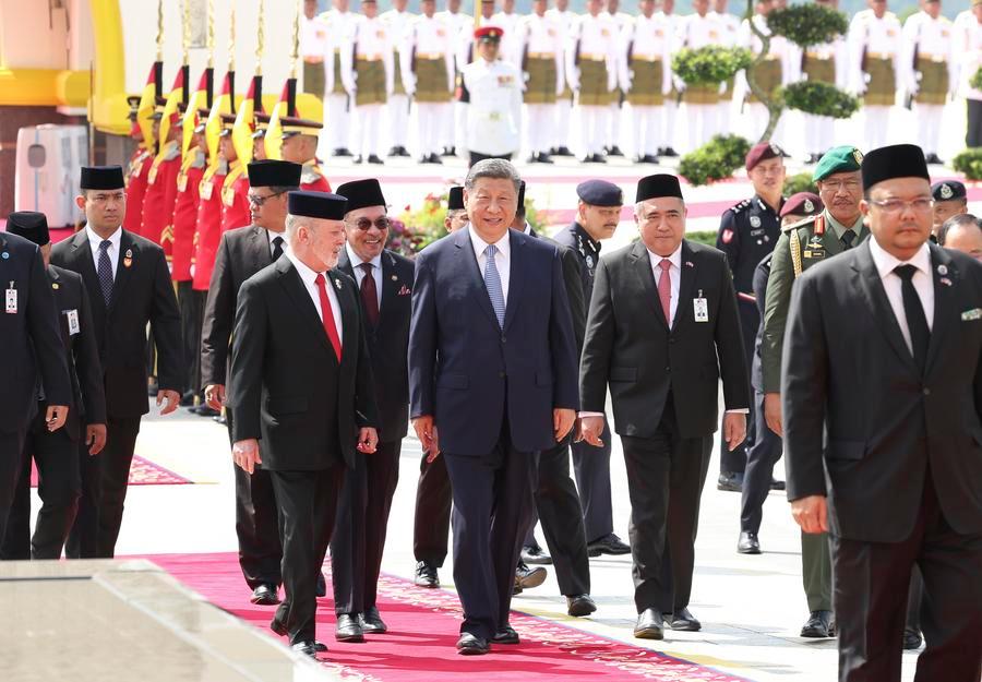 マレーシアの王宮広場で、習近平国家主席(前列中央)の歓迎式典を行う同国最高元首のイブラヒム国王(同左)。習氏は4月16日、マレーシアの王宮でイブラヒム国王と会談した。(4月16日撮影、クアラルンプール=新華社記者/黄敬文)