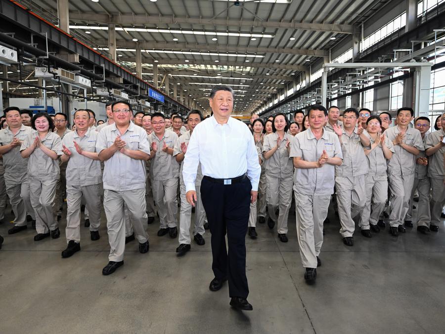 洛陽軸承集団のスマート工場で、従業員とカメラに収まる習近平中国共産党中央委員会総書記・国家主席・中央軍事委員会主席(中央)。習氏は5月19、20両日、河南省を視察した。(5月19日撮影、洛陽=新華社記者/燕雁)
