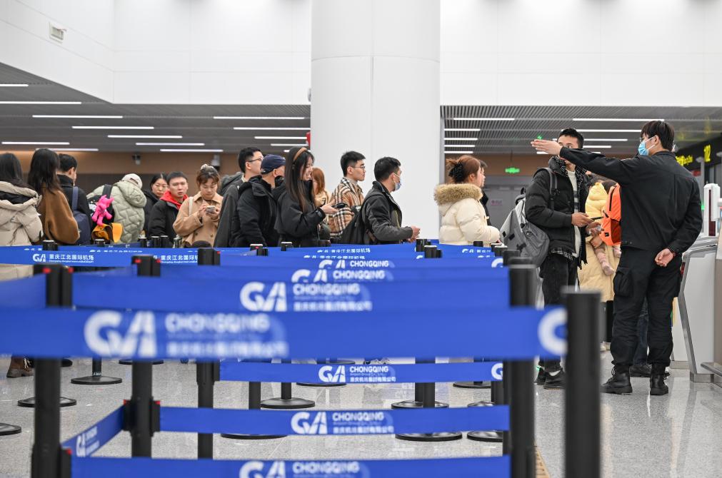 重慶江北国際空港で搭乗口へ向かう乗客。(2025年12月31日撮影、重慶=新華社記者/陳誠)