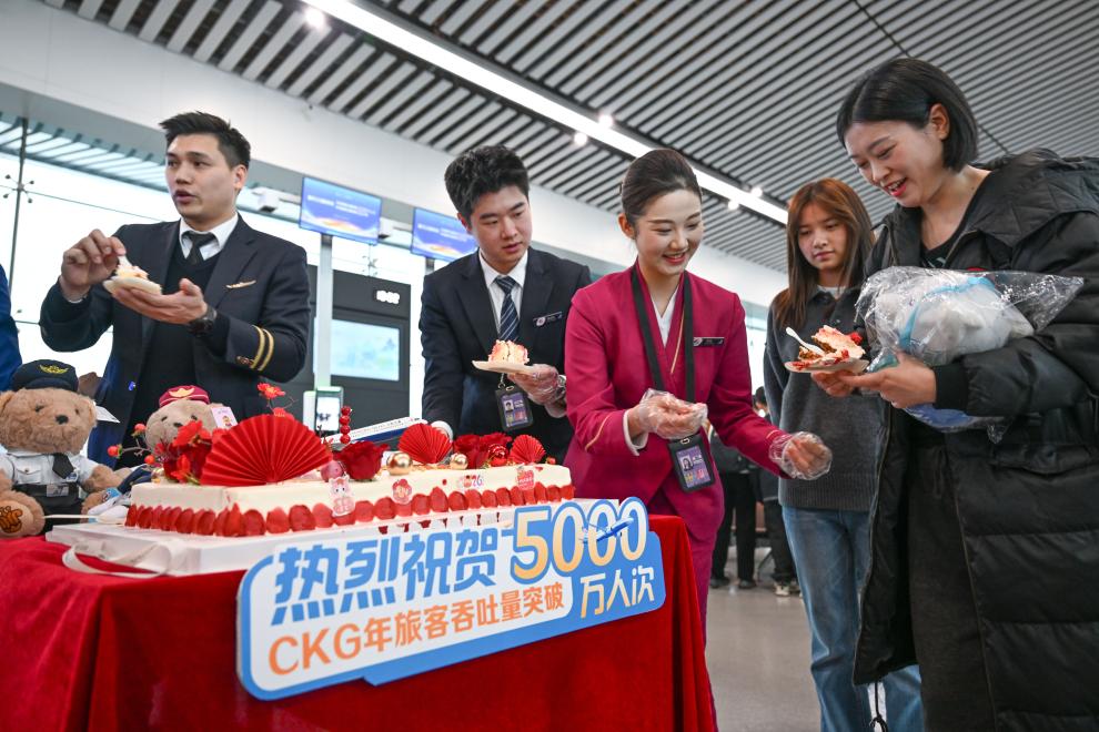 重慶江北国際空港で、旅客数5千万人突破を記念して乗客にケーキを配る航空会社の職員。(2025年12月31日撮影、重慶=新華社記者/陳誠)