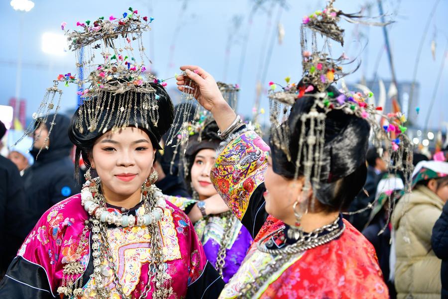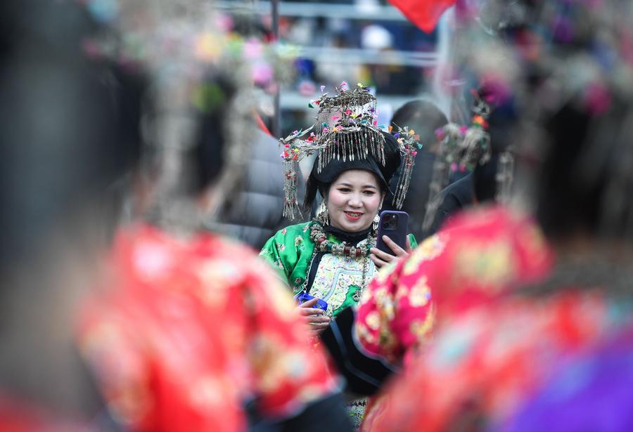 2日、第4回貴州「村超」の開会式会場で、髪飾りを整えるトン族の人。(榕江=新華社記者/楊文斌)