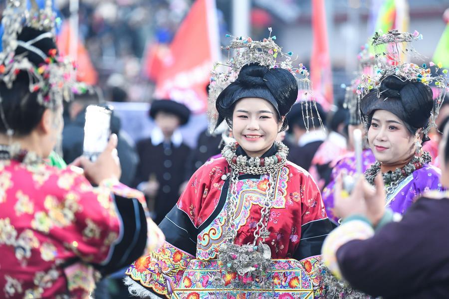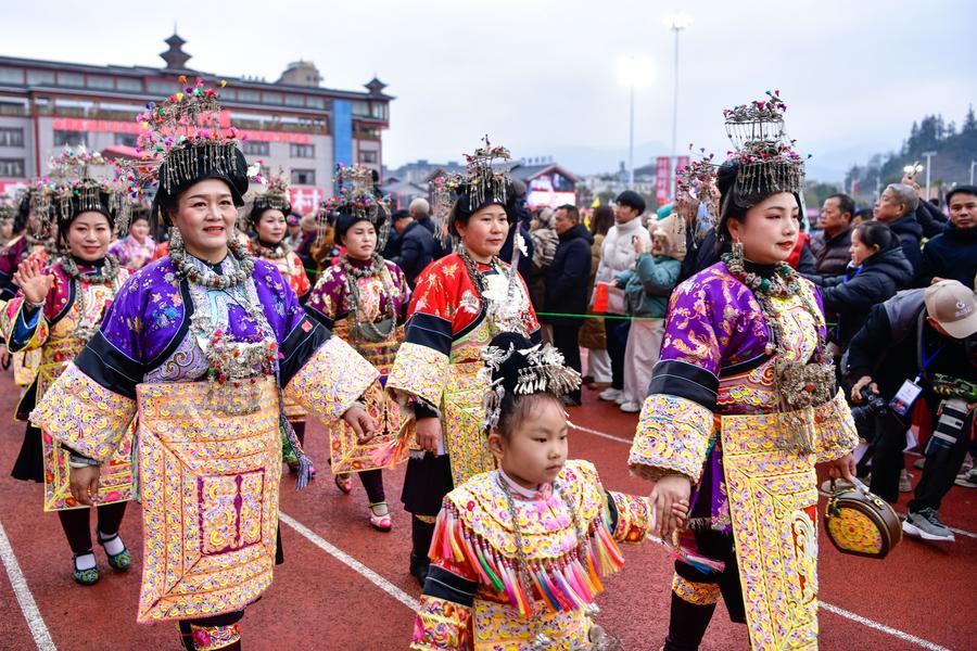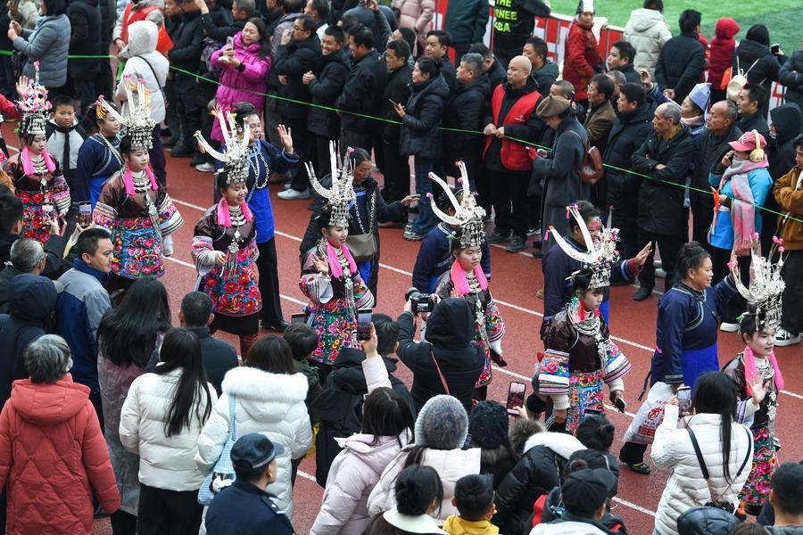 2日、第4回貴州「村超」の開会式で、パレードに参加するミャオ族の人たち。(榕江=新華社記者/楊文斌)