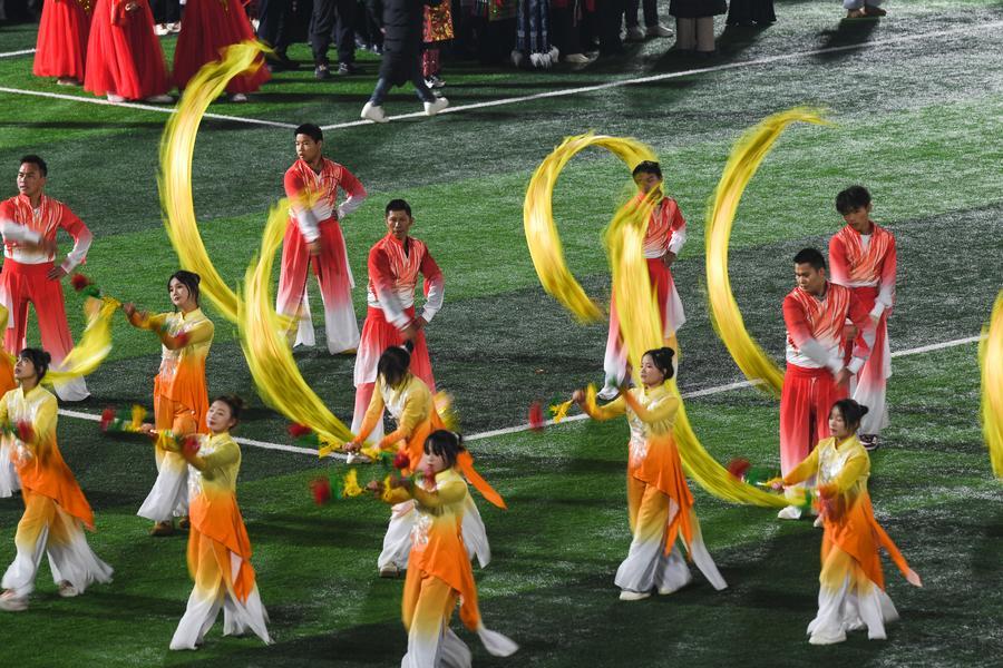 2日、第4回貴州「村超」の開会式イベントで披露されたパフォーマンス。(榕江=新華社記者/楊文斌)