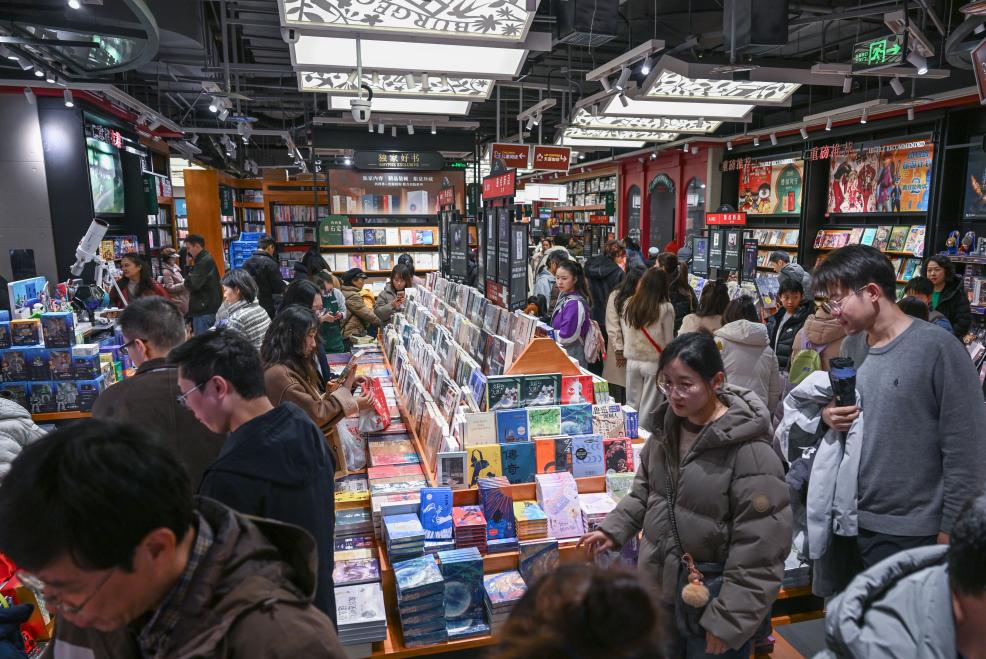 2日、重慶市両江新区のショッピングモールにある書店で本を選ぶ人々。(重慶=新華社記者/陳誠)