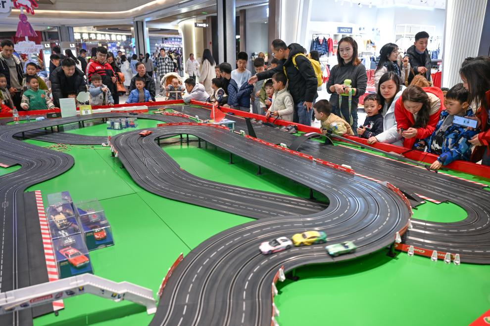 2日、重慶市両江新区のショッピングモールで、おもちゃのサーキットに集まった子どもたち。(重慶=新華社記者/陳誠)