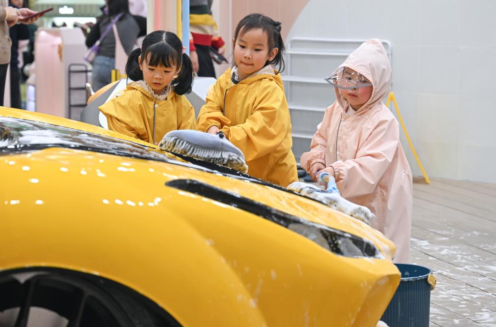 2日、重慶市両江新区のショッピングモールで洗車を体験する子どもたち。(重慶=新華社記者/陳誠)