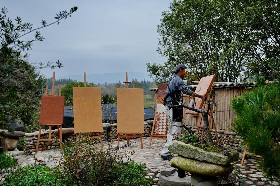 武夷岩彩画の画家、胡磊(こ・らい)さんが展覧会に向けて制作している作品。(12月5日撮影、武夷山=新華社配信/陳穎)