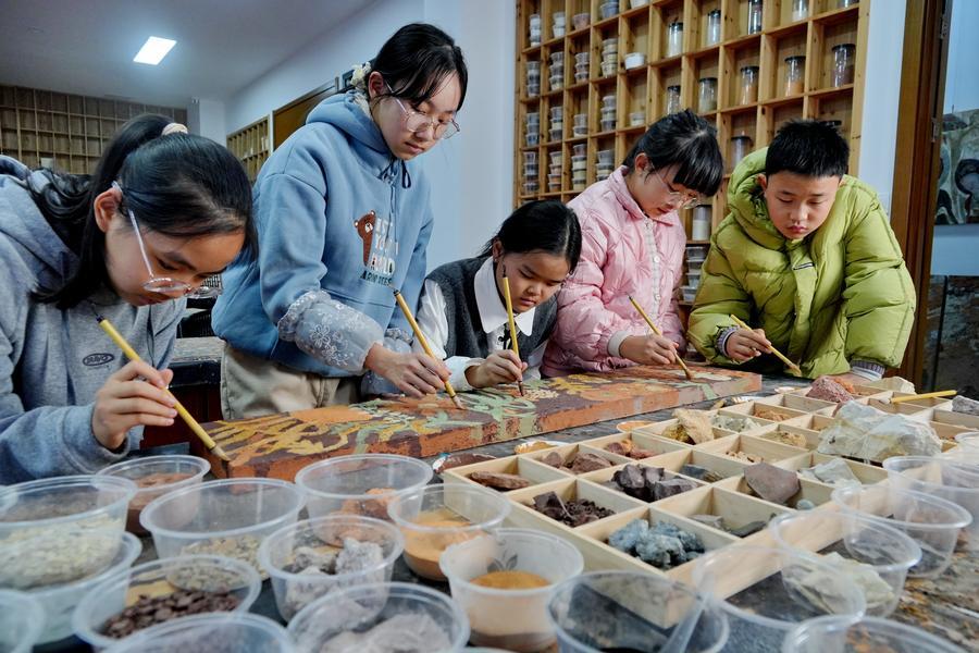 武夷山市文化館の岩彩画講座で作品を共同制作する子どもたち。(12月20日撮影、武夷山=新華社配信/陳穎)