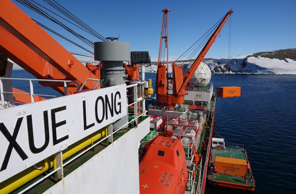 【新華社雪竜1月4日】中国の第42次南極観測を担う極地調査砕氷船「雪竜」が2025年12月29日、南極の秦嶺基地沖の海域に到着し、物資の荷揚げ作業を開始した。搬入物資の重量は約1400トンで、秦嶺基地の後方支援物資、建設資材、研究資材、燃料などが含まれ、バージ船を使って基地へと運ばれた。