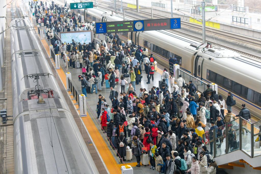 3日、河南省・洛陽竜門駅のホームで、乗車を待つ乗客ら。(洛陽=新華社配信/張怡熙)
