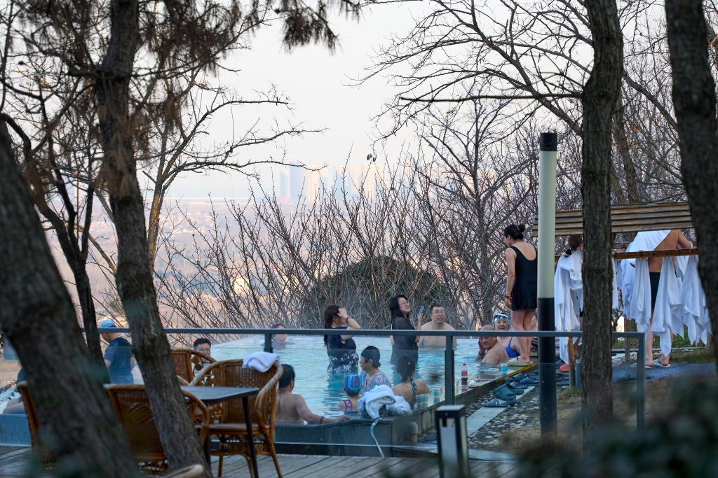 3日、青島市即墨区にある温泉風景区を訪れ温泉を体験する観光客。(青島=新華社配信)