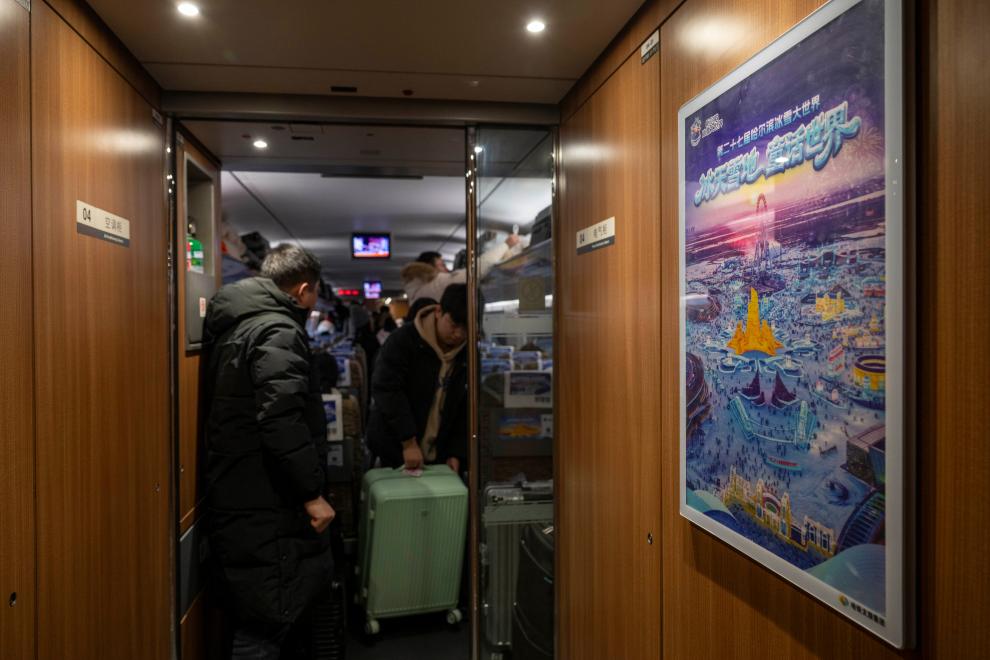 4日、「ハルビン氷雪大世界」をテーマとする高速鉄道列車G1276号で荷物を整える乗客。(ハルビン=新華社記者/張濤)