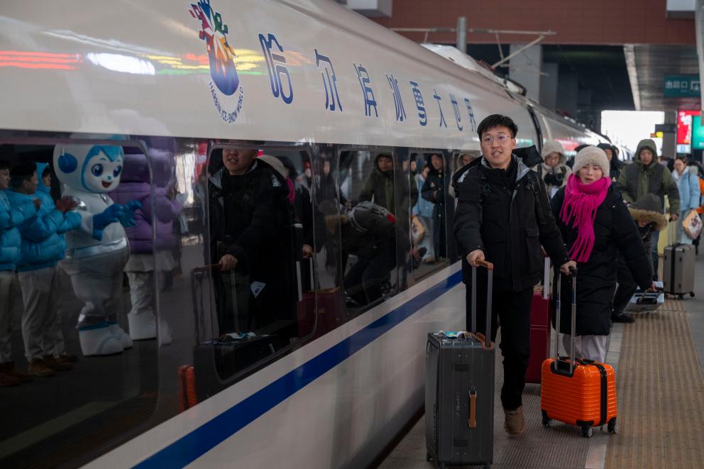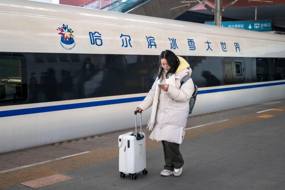 4日、ハルビン西駅のホームを歩く「ハルビン氷雪大世界」をテーマとする高速鉄道列車G1276の乗客。(ハルビン=新華社記者/張濤)