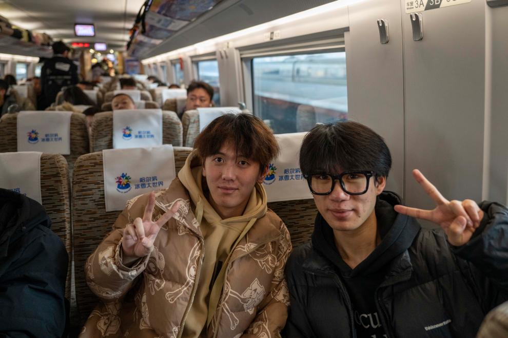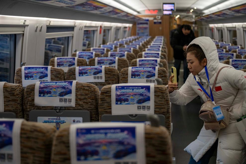 4日、「ハルビン氷雪大世界」をテーマとする高速鉄道列車G1276号の車内で撮影するイベントのゲスト。(ハルビン=新華社記者/張濤)