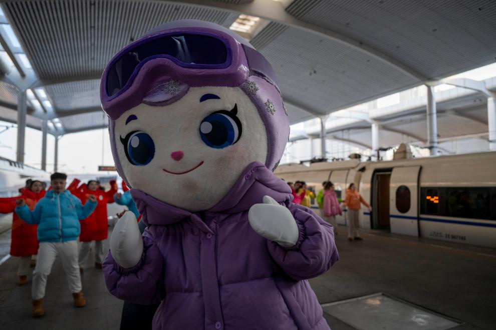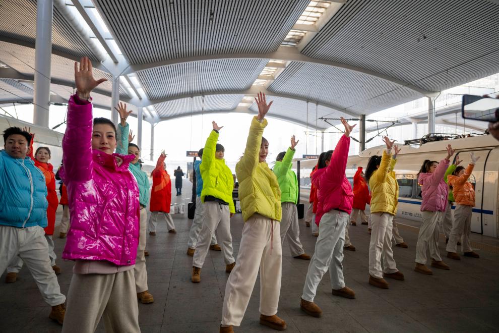 4日、「ハルビン氷雪大世界」をテーマとする高速鉄道列車G1276号が停車するホームで、パフォーマンスを披露するイベント出演者。(ハルビン=新華社記者/張濤)
